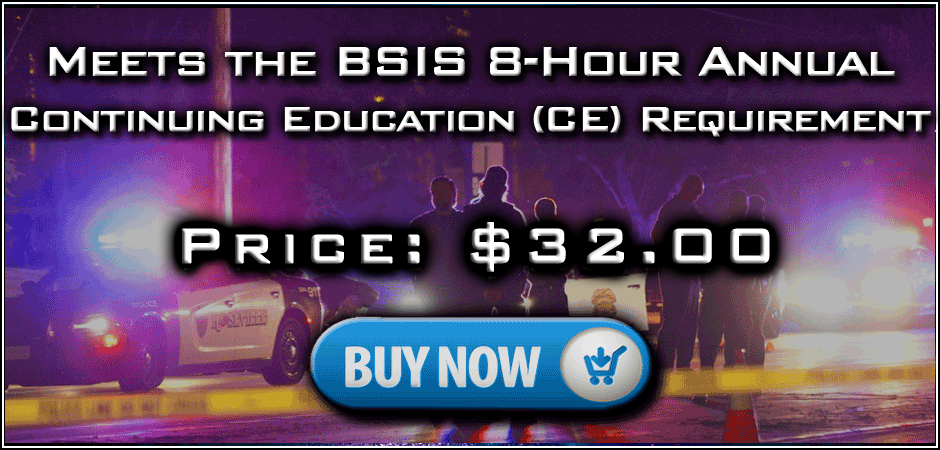 This course meets the CA State BSIS 8-hour annual continuing education (CE) requirement for security guards and PSOs. The BSIS requires that all licensed security guards and PSOs take